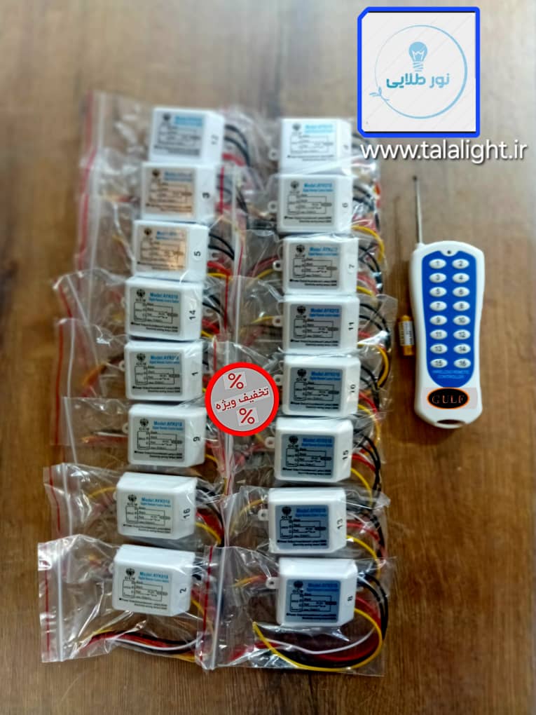 ریموت کنترل 16 کانال گلف با گیرنده های مجزا دارای یک کنترل با برد 30 متری برای لوستر و لوازم برقی و روشنایی , لامپ , چراغ , لوستر , پمپ آب و ... استفاده میشود .